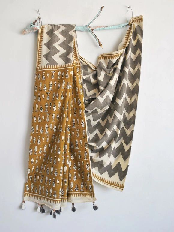 Mustard & Grey Abstract Chevron Printed Cotton Saree with Tassels