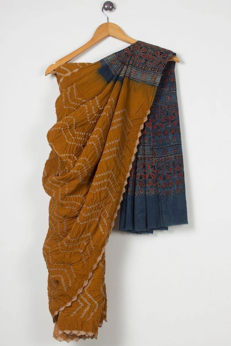 Mustard Ajrakh & Shibori Cotton Saree with Designer Pallu