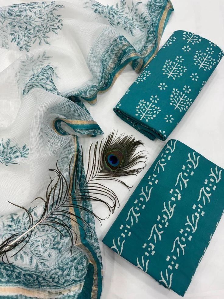 Elegant Teal Block Printed Cotton Suit Set with Dupatta